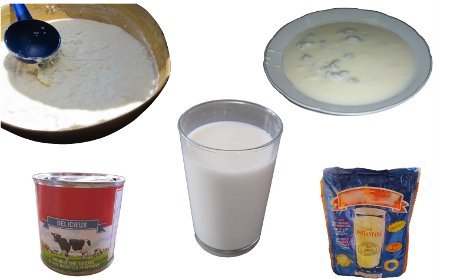 Lait : lait de vache frais, en poudre, concentré (en boîte) ou lait caillé